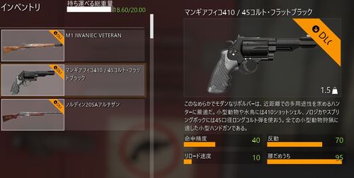 愛用銃。現在レベル12?くらい。 上のライフルがM1イワニエツベテラン、エムワン。リロード時にきぃーんってなるやつ。装弾数も多く反動も低いので遠距離をサイトでアメリカグマを狙ったときに直撃外しても二発目を狙える。 中段のハンドガンがマンギアフ…